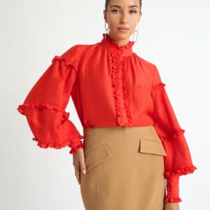 Demand their attention in decadent red. Introducing the Highfield Blouse - showcasing a relaxed fit, balloon sleeves, ruffle detailing and front placket button closure. Pair with our Bethany Skirt and Tori Earrings to complete the look.?~section~Woven Tencel blend fabrication Relaxed fit styling Front button placket with self fabric buttons Ruffles are front placet, neckline and...
